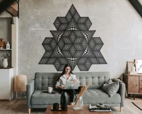 Laser-cut details will become a spectacular accent in the bedroom, kitchen, guest room, or meditation space. This panel can be used to decorate the interior of a recording studio, cabinet, office, conference hall, reception, bar, restaurant, cafe, hotel, shop. This dismountable creation is suitable for decorating a stage, yoga hall or a studio. Modules are dismountable and suitable for occasional event decoration needs. When assembled, the composition has a size 207*200 cm ( 81,5*78,7 inches).